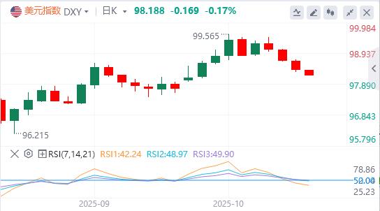 10月17日,北京时间周五亚市早盘,美元指数徘徊在98.18附近。周四,美元指数延续跌势,最终收跌0.31%,报98.361。美债收益率普跌,基准的10年期美债收益率跌破4%,最终收报3.973%,对美联储政策利率敏感的2年期美债收益率收报3.431%。随着美国信贷市场爆雷推动避险情绪升温,以及美联储降息预期增强,现货黄金连续第四个交易日创下历史新高,单日暴涨115美元至每盎司4300美元以上,最终收涨2.8%,收报4326.12美元/盎司;现货白银站上54美元关口,最终收涨2.19%,报54.15美元/盎司。石油供应过剩加剧以及对全球经济前景的担忧,令国际原油再创五个多月新低。WTI原油美盘跟随风险资产跳水,最终收跌2.39%,报56.87美元/桶;布伦特原油最终收跌2.23%,报60.84美元/桶。