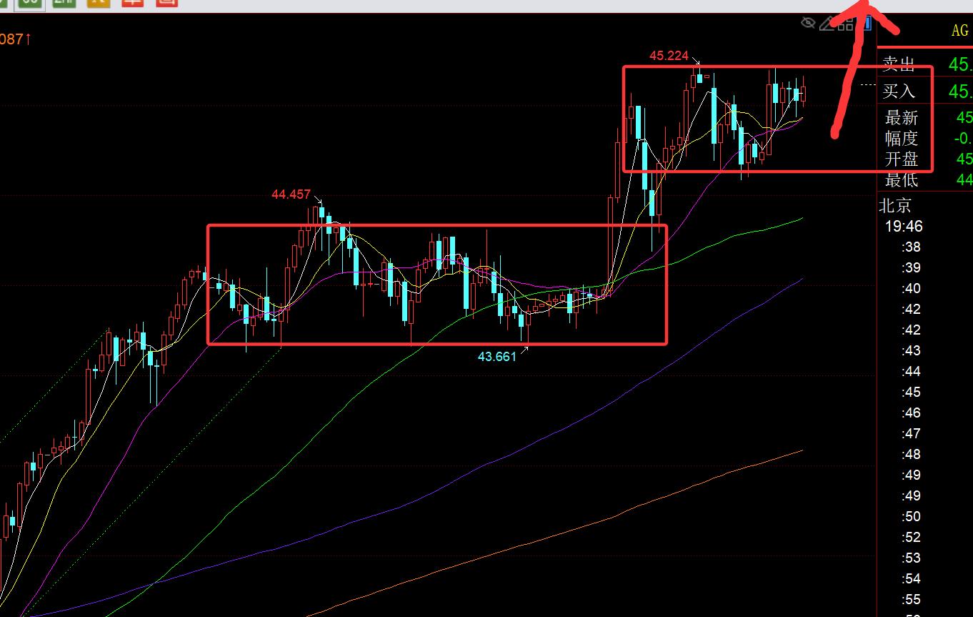 第二,白銀方面:白銀的走勢依舊強於黃金,今年它還真的有望出現間隔15年以來的單邊強勢補漲,有望衝擊50關口;昨日本計劃43.6、43.3去看漲,早間未給到機會,歐盤直接強勢猛漲刷近期新高,美盤則二次跟隨看漲,依托頂底支撐44.3一線,最終成功抵達45目標,最高45.2,比較給力,基本上這一波就挽回了黃金歐盤追漲的損失;