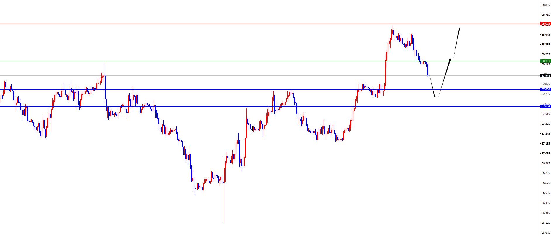 從多周期分析,週線級別來看近期價格在周線關鍵上下盤整,目前週線支撐於97.80區域,同時在上週價格站上週線阻力,後續看中期看多頭延續。從日線級別看,隨著時間的推移目前日線支撐於97.60區域,價格此位置之上波段進一步上漲。從四小時上看,目前看四小時支撐於98.15阻力,價格在此位置之下先看承壓,之後測試到日線及週線支撐區間出現反K再看多頭延續,如若價格再度站穩四小時阻力則繼續看延續。