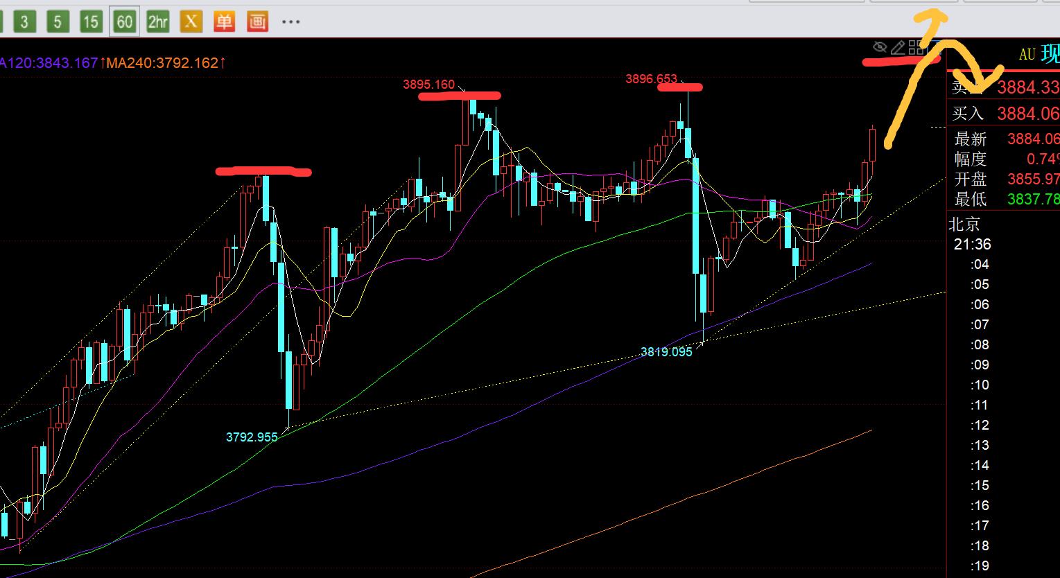 第三,黃金小時線級別:早間小幅先拉升觸及中軌出現承壓,當9點收報陰包陽之後,價格重新打回3858之下,就果斷先跟隨一波看跌回落,最終目標接近3837,它是處於隔夜反彈的618分割支撐;午後14點一根大陽又直接再次試探中軌,吞沒前面陰K,就意味著下跌動能不足了,強調一旦重新收盤站上中軌,就需要跟隨一波看漲。因此15點陽線的出現,就果斷3860跟隨看漲,當前漲至3880上;接下來就看今晚會不會再出現昨晚的多空殺套路,一路逼空至刺破昨日高點,再快速回測打壓,所以3897突破之後,就要密切留意是否出現快速承壓動作,形態則是長上影K,最好是陰線,那麼就要小心承壓回落;目前維持逼空拉升中,阻力3897之上謹慎追漲,它若不出現循環打壓跳水,而是維持一路連陽走高,那麼下周初基本要站穩3900而進一步強勢單邊發力,屆時就繼續強勢博續漲;