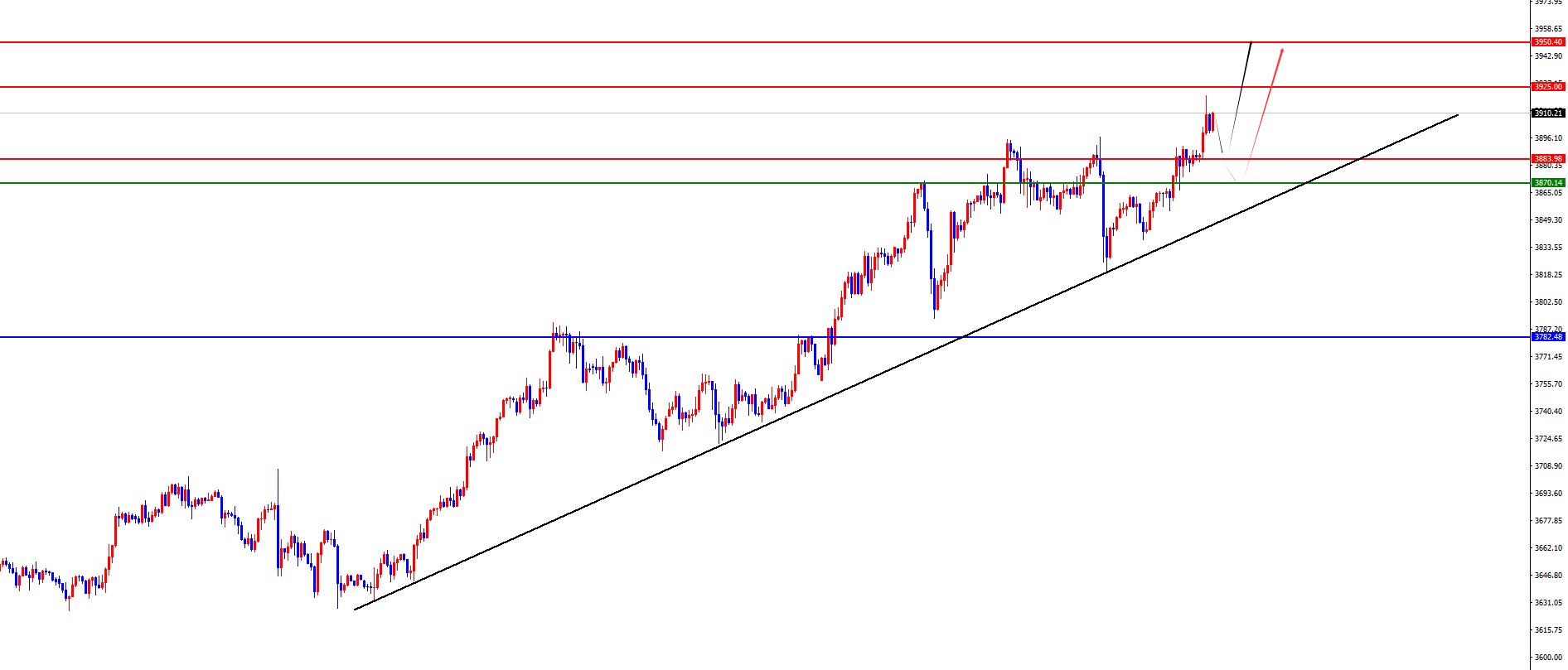 從多周期分析,首先觀察月線節奏,從長線上看3130位置是長線走勢的分水嶺,價格在此位置之上長線多對待即可。從周線級別看,目前週線多空分水嶺於3531位置,價格在此位置之上中線多對待即可。從日線級別看,暫時需要關注3782區域支撐,此位置之上波段多對待,目前繼續右側交易方式對待。從四小時上看,近期四小時上價格有兩種方式,第一中是價格距離日線支撐較遠時,價格依托四小時支撐上漲,價格進行下破四小時支撐後沒有延續,而是依托下破四小時支撐後低點位置繼續上漲。第二中距離日線較近時,價格測試到日線支撐後上漲。上週五價格明顯屬於第一種情況。目前四小時上暫時關注3875及3884兩個支撐。一小時上,早盤直接再度強勢突破3900位置,則目前強勢對待,短線上早盤低點成關鍵,激進者在早盤低點沒有下破前維持多,保守者依托四小時支撐看上漲即可。