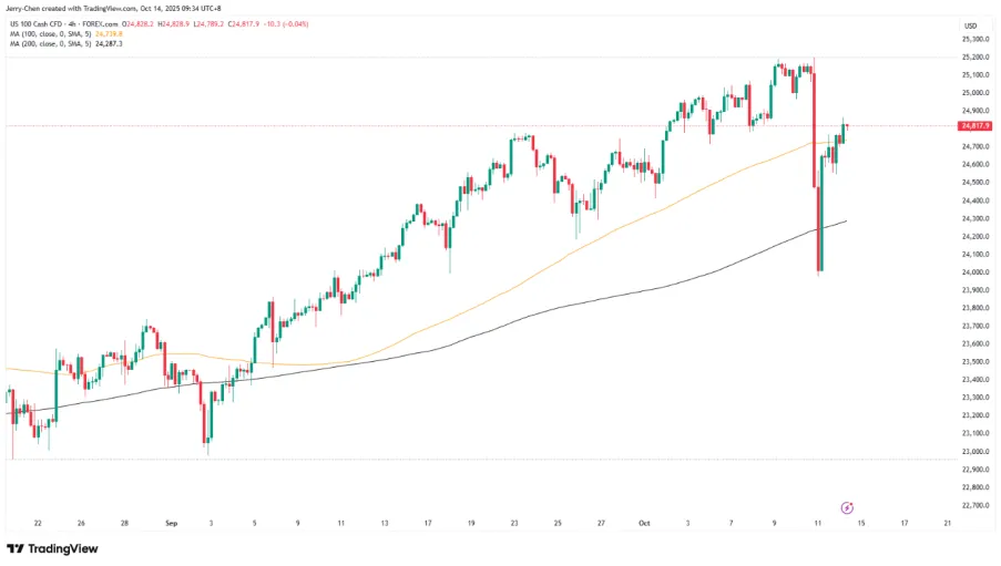 值得注意的是,隨著倫敦白銀庫存告急,倫敦白銀現貨價格和紐約期貨價格出現了史無前例的溢價水平。儘管有大量的紐約白銀庫存正在運往倫敦,但在強勁的投資和實物需求驅動下,白銀的瘋狂或將持續。 美國銀行將2026年黃金目標價格上調至5000美元/盎司,白銀上調至65美元/盎司。 貨幣市場,澳元隔夜領漲,日元和歐元則跌幅居前,美/日收盤重回152上方。 週二關注鮑威爾講話(23:30)以及摩根大通、高盛、花旗等銀行股財報。在經濟數據真空的情況下,財報或具有更大的參考價值。 來源:TradingView,Forex.com 美/日週一在151.20附近企穩後延續上行,在趨勢線的幫助下匯價有望繼續向前高153.30邁進,突破後多頭目標上移至154-155區域。日本國內政局變化是日元現階段走弱的主要原因,日本央行年內加息概率已經不足40%。 下行方向,若跌破150後恐再次下探146.50一線。 來源:TradingView,Forex.com 隨著關稅威脅降溫以及AI熱潮的延續,市場情緒迎來急速反轉,這有望幫助納斯達克100指數繼續收復週五的失地,並挑戰前高25200。 反之,若跌破24550後將增加高位震蕩的概率,但在宏觀黃金維持穩定的情況下,逢低買入依然適用。 以上內容就是關於“【XM外匯官網】:【今日重點關注】金銀勢不可擋,TACO交易助力美股反彈”的全部內容,是由XM外匯小編認真整理編輯的,希望對你的交易有所幫助!感謝支持! 因筆者能力有限、時間緊迫等原因,文中有些內容仍需繼續探討和深入研究。因此,今後筆者將就下列問題進行延伸性的研究和探討:
