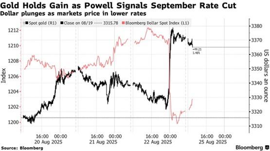 XM xmh100.commentary: Federal Reserve Chairman Powell delivered a speech at Jackson Hall Economics Seminar last Friday, pointing out that labor market risks are rising - although inflation concerns remain. The policy-sensitive two-year Treasury yield plummeted, while the indicators that measure the strength of the dollar fell after Powell's speech, and the U.S. stock market and gold once carnival. On the same day, the Dow Jones Index hit its first record high this year, with gold recording its biggest gain in three weeks, and spot silver rose 1.72% in a single day.