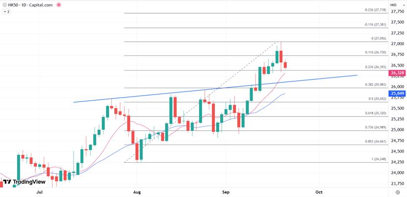 XM Hong Kong Stocks: After the cumulative increase of 6% in the previous three weeks, the early market of Hong Kong stocks today was soft. Today, the Hang Seng Index opened 85 points lower, reaching 26459 points and then fell repeatedly, once at most 304 points, falling 264 points or 1% in the half-day to 26,280 points; the Chinese index fell 122 points or 1.3% to 9,349 points; the Hang Seng Technology Index fell 74 points or 1.2% to 6,220 points.