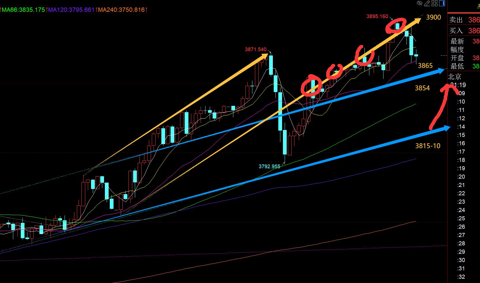 For tonight, individuals tend to be patient to wait close to the daily 5 moving average 3815-10 to grasp a good low again. At this time, pay attention to the middle rail 3865 and the upper rail support of the blue channel 3854. Once these two positions are lost one after another, it will basically be a large-scale washing of long and short ones; if these two support is maintained, you will maintain it.Relatively high-level oscillation operation;