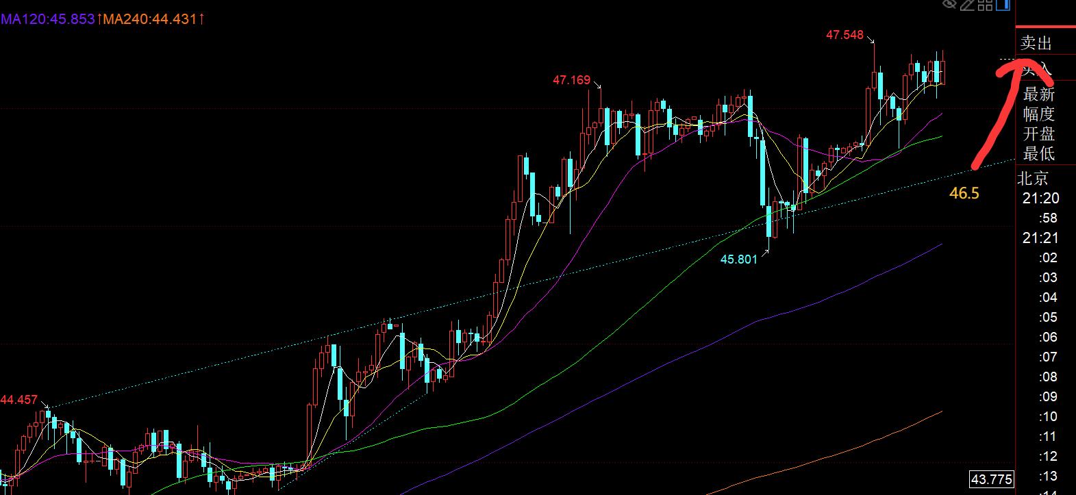 Second, in terms of silver: Yesterday, the European session was also profit hedging protection, 46.The 75-line prompted short selling hedging. The US market was short at 46.1, leaving long, and then rose to 46.75 in the evening, which means that the band bottom position is long, and also grabbed the price difference profit of 30 to 40 meters;