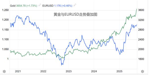 del 30 de julio al presente, el oro de Londres aumentó desde su punto más bajo de $ 3,267 hasta su punto más alto de $ 3,659, con un aumento acumulativo de aproximadamente el 12%; Durante el mismo período, Eurusd aumentó desde su punto más bajo de 1.1390 hasta su punto más alto de 1.1779, un rango de 389 puntos, un rango de 3.4%, aproximadamente una cuarta parte del aumento del oro. Además del aumento, los dos también son diferentes en el proceso de aumento. El aumento del oro se está propagando con líneas K positivas continuas, mientras que el ascenso del euro está lleno de giros y vueltas, a menudo con una línea positiva que aparece después de una línea positiva. También beneficiándose de la expectativa de los recortes de tasas de interés de la Fed, las ganancias del euro se quedan muy por detrás del oro. ¿Cuál es la razón?