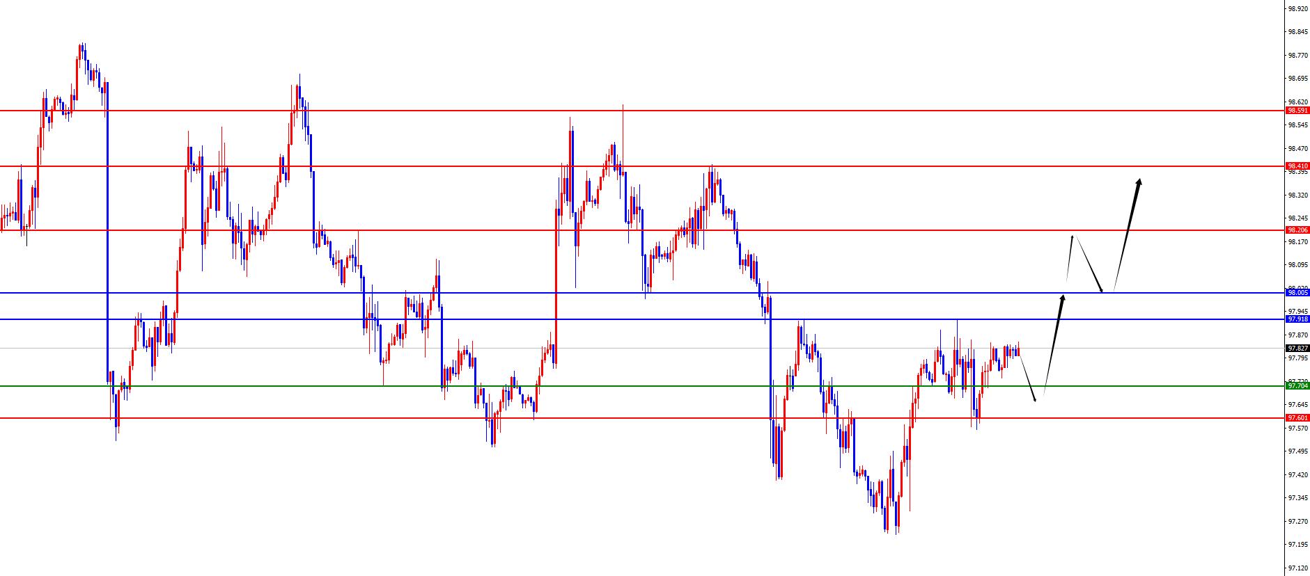 De un análisis de múltiples ciclos, el precio se ha consolidado recientemente en el nivel semanal. Actualmente, la resistencia semanal se encuentra en el área de 97.90, y el precio tiene un hombro corto por debajo de esta posición. El precio solo girará mucho después del cierre semanal posterior por encima de esta posición. Desde el nivel diario, a medida que pasa el tiempo, la resistencia diaria actual está en el área 98. En la actualidad, es necesario prestar atención a si el precio puede estabilizar la resistencia de resonancia diaria y semanal. Desde la perspectiva de cuatro horas, ayer, aumentó aún más después de volver sobre el apoyo de cuatro horas según lo programado. Actualmente, el precio todavía está por encima del soporte de cuatro horas. Hoy, se centra en el soporte en el rango 97.60-70, y por encima, el rango 97.90-98 se ha estabilizado. En la primera hora, la fluctuación a corto plazo actualmente muestra un aumento volátil, por lo que continúe esperando que el apoyo aumente antes de que el precio continúe aumentando después de que se estabilice en el futuro.