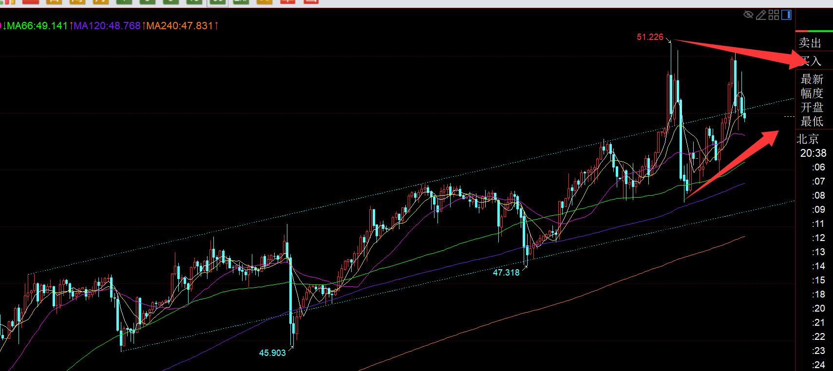 Argent : Hier, il a accéléré jusqu'à 51,2 puis est retombé au milieu de la nuit. Le cours de clôture quotidien présentait une longue ombre supérieure K, mais il s'est toujours stabilisé au-dessus de la moyenne mobile de 5.Aujourd'hui, en s'appuyant sur le deuxième impact ascendant du 5, 51 ont encore grimpé plus haut et sont retombés. C'est relativement normal, car les fluctuations sur ces deux jours sont assez importantes. Elle doit se consolider pour réduire la volatilité, et pour digérer et réparer certains indicateurs à la hausse défavorables grâce à la consolidation ; ce soir, faites attention au petit triangle dans le graphique. Le support inférieur est au-dessus de 49,3 et la résistance supérieure est de 51, ce qui se situe dans la fourchette. Exploitation et tri ;
