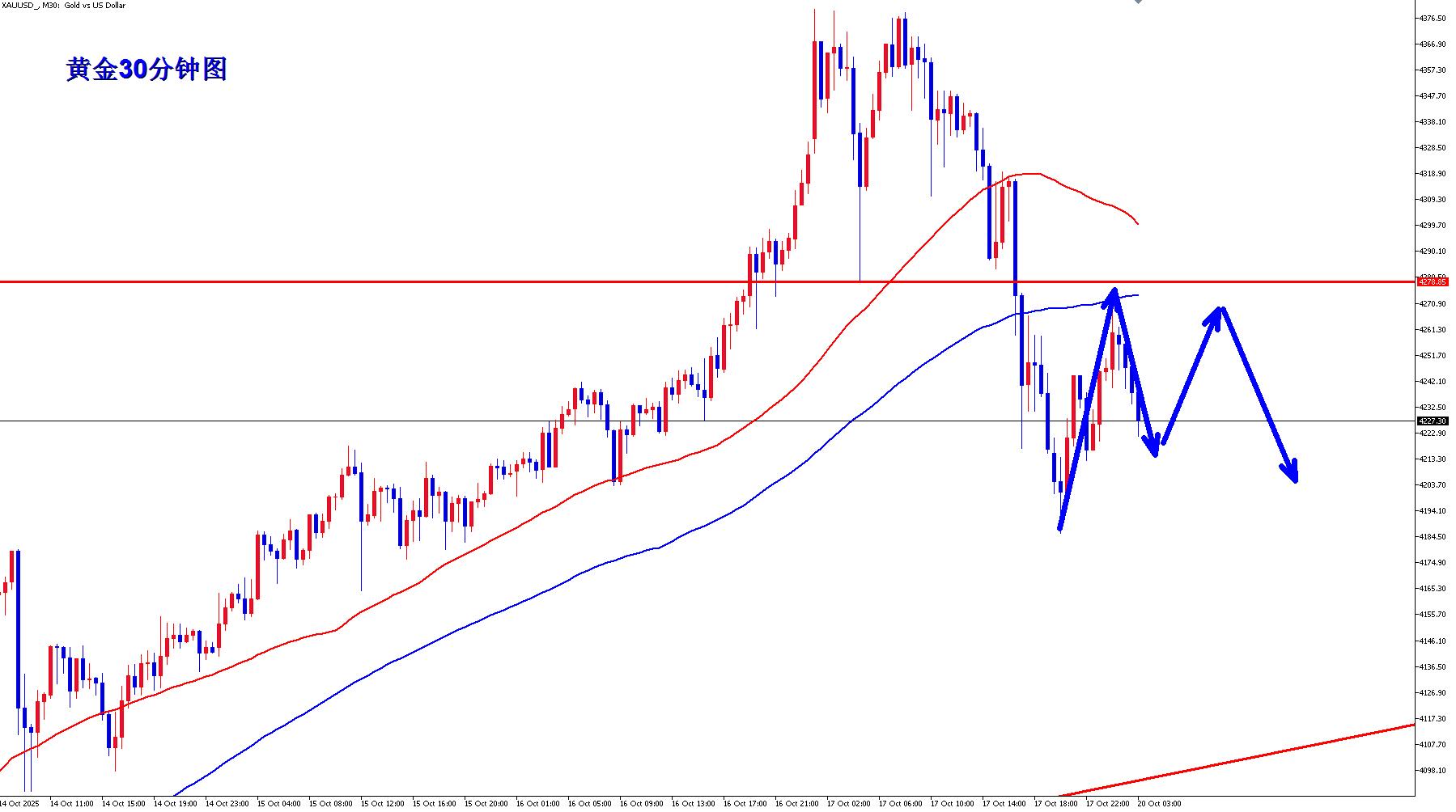 黄金30分钟均线已经开始向下拐头,如果黄金30分钟均线向下形成死叉,那么黄金30分钟调整就还有下行空间,黄金早盘即使避险都还是没有冲破4280的阻力压制,说明黄金4280依然是当下的多空分水岭,早盘反弹承压4280继续逢高空。