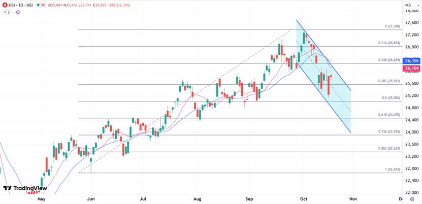 XM港股:今早公布的中国第三季经济增长胜预期,加上中美元首可能在两周内会面,市场憧憬中美紧张关系缓和,上周累计跌超千点的港股半日升逾600点。恒指半日升607点或2.4%,报25854点。国指升221点或2.5%,报9233点;科指涨184点或3.2%,报5945点。
