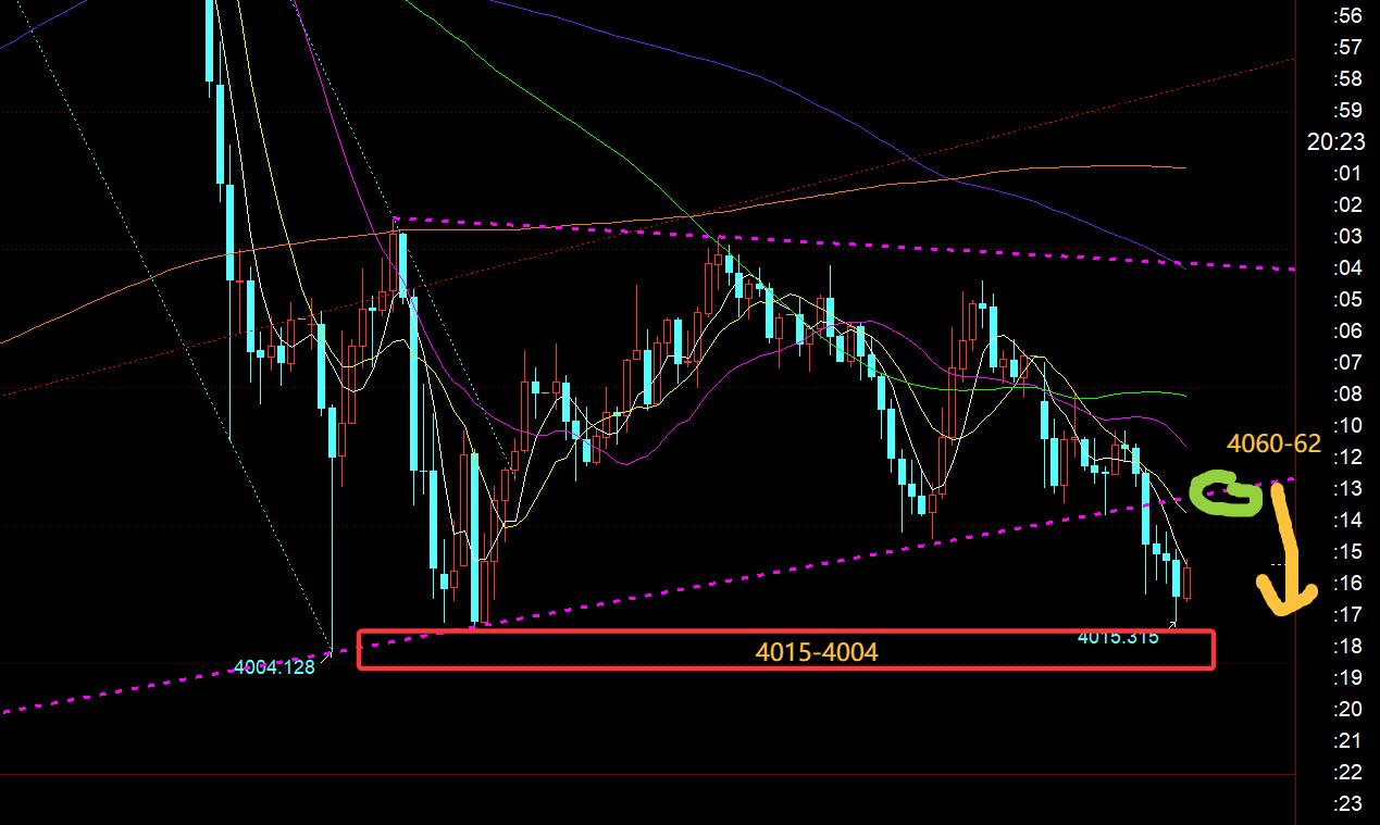 第四,黄金小时线级别:从上图看,底部收敛三角今日欧盘期间连阴向下破位,那么美盘前后先反弹一波,容易诱多,存在二次下行,关注通道反压点4060上下承压短线看跌,下方支撑4015和4004,若失守4000关口,则留意3975、3945,极限3914上;个人认为下方空间是不大的,或者时间是不长久的,2小时,4小时届时都会处于底背离状态,拉低是很容易突袭超跌反弹的;所以,不反弹到位之前,尽量也不去追跌;另外,若价格又突破4060上行重新回到收敛三角内,要么它扩大收敛范围继续整理,要么慢慢企稳上攻,届时就不能盲目看跌;因此,今晚要去二次看跌,收盘一定不能重新回到图中紫色三角之内,而要低位看涨则需等二次下跌走完或靠近提及的几个支撑出现稳定信号再考虑;