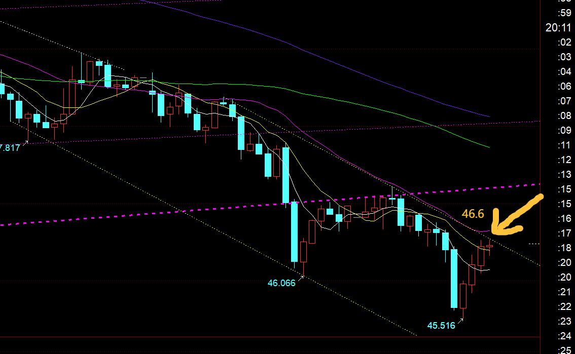 白银方面:白银一口气已经打压修正至周线10均线45.6,小时线macd出现明显底背离,且美盘前也出现相对不错的连阳形态,正在测试下滑通道上轨阻力46.6,也是小时线中轨;对于它,个人认为短期底部也逐步快出来了,下方空间基本不大,随时可能会提前企稳;重点留意46.6,一旦突破站上,则短线反转信号出现,回踩跟随看涨反弹,测试上方47.2、48等;若还压制46.6下行,则留意45.9、45.6上的企稳信号,也有可能等出现二轮背离之后再进行超跌反弹;其实,它这个背离,47.4跌破之后,早已出现了,属于背中背的情形了,非常严重,急需一波超跌反弹;