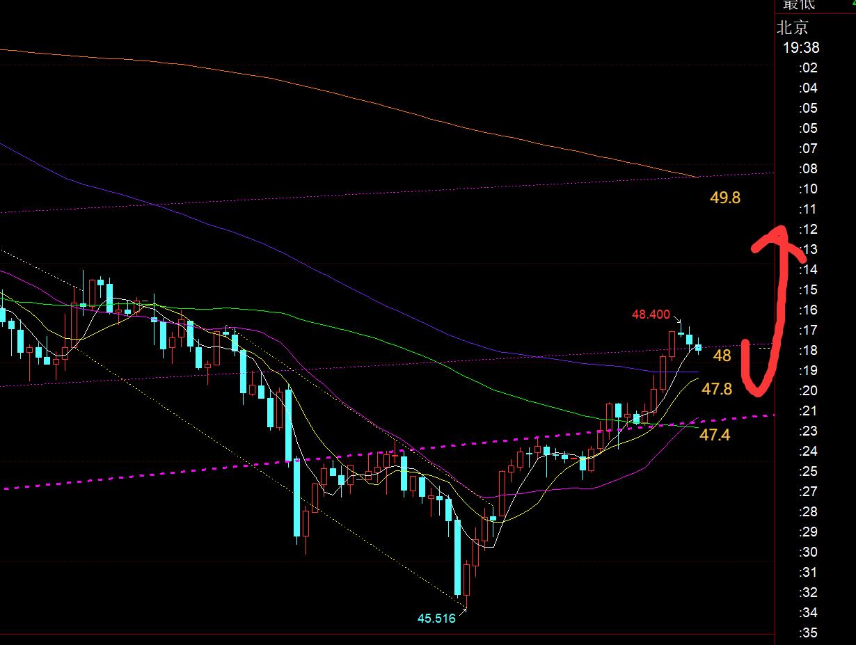 白银方面:白银的表现比黄金强,日线今日已经有所冲破5均线,图中粗的一条紫色趋势线已重新突破站上,那么47.4作为重要的支撑节点,也是此时小时线中轨,只要这里稳住不下,则会进一步的拉升;4小时大阳中轨突破站上,回踩确认的支撑是47.6,小时线10日支撑是47.8,当前徘徊于前期底部整理区间下轨48一线,因此,今晚留意支撑48-47.8-47.6,企稳继续看涨,阻力目标48.4,再上破则留意日线10日和中轨49.3-49.4,乃至49.8等;