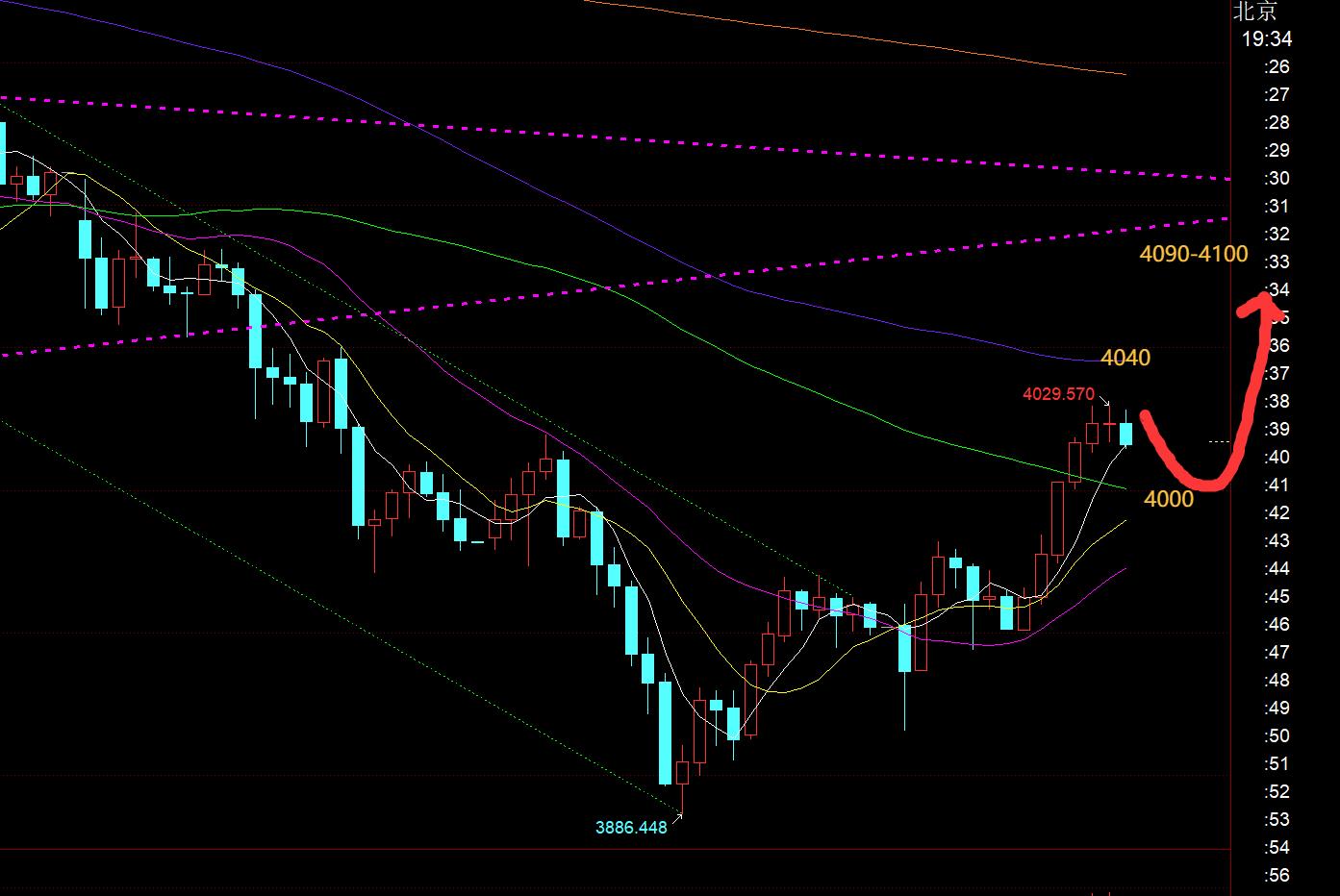 第一,黄金日线级别:这两日一直提到日线若失守中轨,也容易发生假摔行为,也就是很难走弱延续,一般第二日,最迟第三日会出现一根底部大阳再次收盘站上中轨,来完成一个短期底部信号;虽然昨日再次打压破新低的力度有所超预期,不过尾盘收了长下影K还是可以的(原本这根K应该是偏小的),但今日当前出现一根大阳就符合了假摔概率,理论上应该收盘会重新站上中轨4056之上,就看后半夜降息的力度以及老包讲话是否偏鸽;一旦收盘站上5日4040,那么容易去试探10均线4134,再往上就是前期上行通道下轨反压点4200一线,至少会出一个次高点;假如3886是这一波下跌的底,那么参考分割,后市留意的三个阻力就是4075、4134、4192,较强阻力4275-4326(这个去试探可能难度大一些);