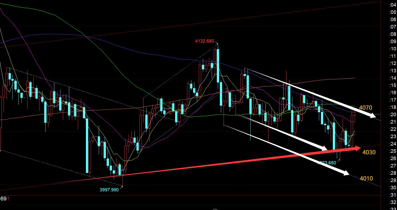 然后4小时级别的年均线支撑依然存在,也出现了多次插针下影;从小时线级别看,亚盘承压图中白色通道上轨4087一线冲高回落,这点在后半夜早已计划提示;欧盘延续承压跌至最低4023,两次进行插针,刺穿红色通道下轨,然后运行于4030-4070范围内震荡一下午;今晚来讲,重点留意白色通道上轨,下移至4070一线,也是前一个小时快速拉升的高位,这里承压不上,则继续会震荡于4070-4030区间,若压制下行,支撑关注4046-40,它是大阳回踩的618分割处,其次是4030上,企稳震荡看涨,极限是日线收敛三角下轨支撑进行插针的话,留意4010一线位置的企稳;另外,若小时线收盘站上4070有效了,那么弱势震荡会转为偏强震荡,上方可能又会反复去试探4100关口;