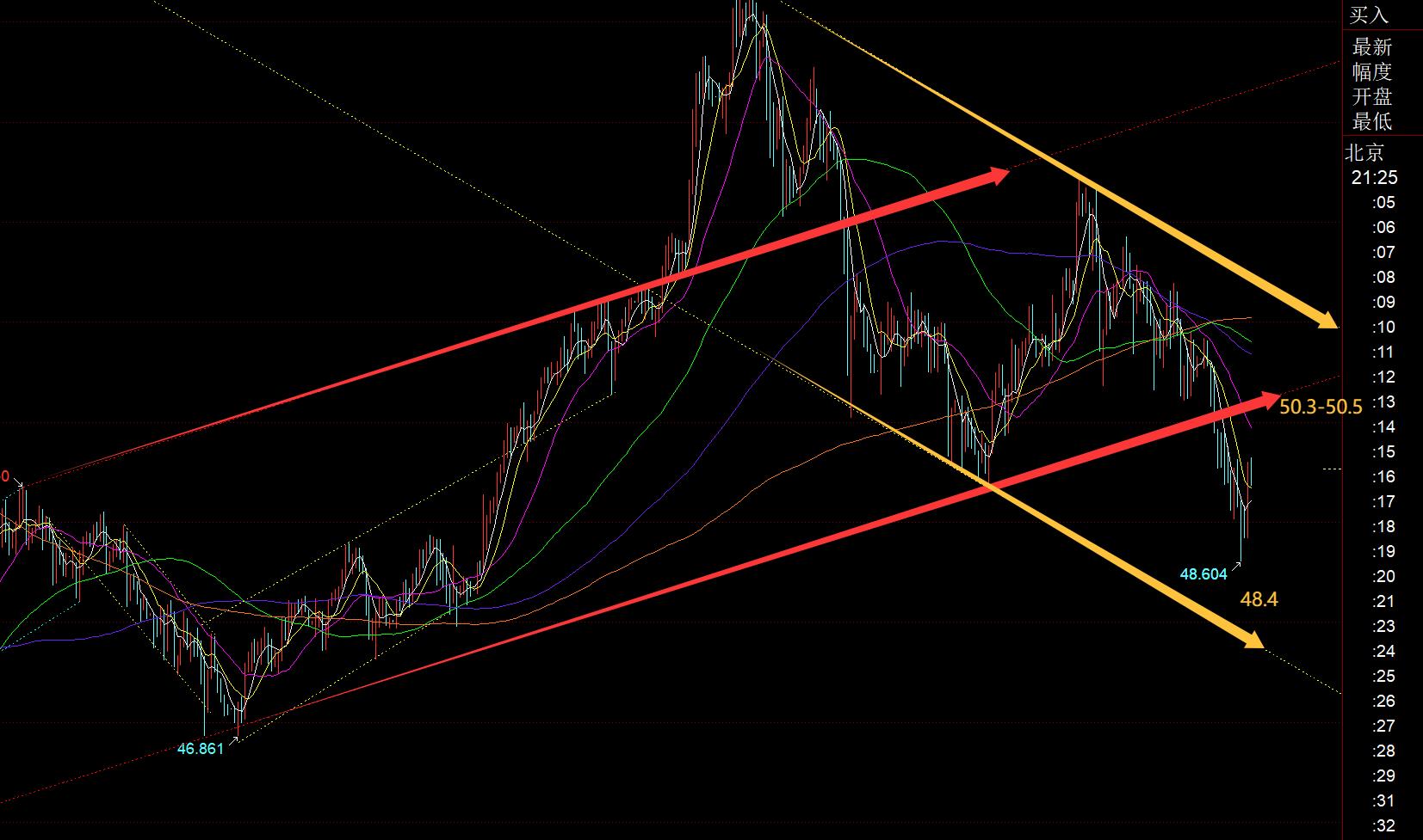 白银方面:白银今日反而比黄金弱很多,亚欧盘持续连阴慢跌,几乎无反弹,直接进行日线级别趋势支撑线的插针,最低48.6,逼近周线10均线支撑48.4;那么就要看尾盘的收线情况,若能长下影出现,收盘于49.35之上,那么还算乐观;不过本周原本看的五浪拉升基本失败,宽幅整理中对待;高位大区间关注54.4-47.5;今晚关注红色通道下轨反压50.2-50.3,承压注意回落,支撑48.4-48.6;若重新回到红色通道内,那么下周初会回归震荡上行可能,不再太弱;
