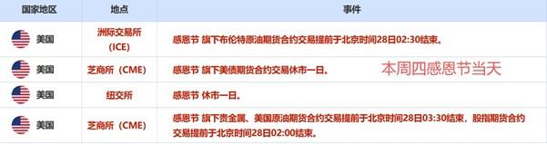 本周四美国将迎来全国性重要假期感恩节,隔天是黑色星期五购物节,美国主要交易所均发布假期休市公告。纽约证券交易所宣布,感恩节当天,休市一日;黑色星期五提前于北京时间29日02:00休市,原本的休市时间在北京时间05:00。芝加哥商品交易所CME宣布,感恩节当天,旗下美债期货合约交易休市一日;旗下贵金属、美国原油期货合约交易提前于北京时间28日03:30结束,股指期货合约交易提前于北京时间28日02:00结束,两者原本的休市时间在北京时间06:00。黑色星期五当天,旗下美债期货合约交易提前于北京时间29日03:30结束,旗下贵金属、美国原油、外汇期货合约交易提前于北京时间29日03:45结束,股指期货合约交易提前于北京时间29日02:15结束。洲际交易所ICE宣布,感恩节当天,旗下布伦特原油期货合约交易提前于北京时间28日02:30结束,原本的休市时间在北京时间05:00。黑色星期五当天,旗下布伦特原油期货合约交易提前于北京时间29日04:00结束。