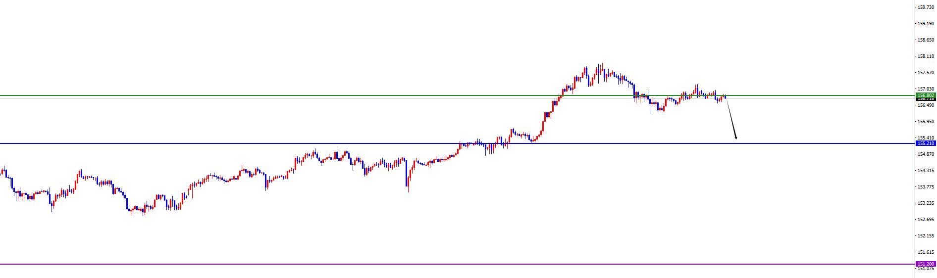 短线分水岭156.80-90区域,价格没有出现反转信号之前维持空