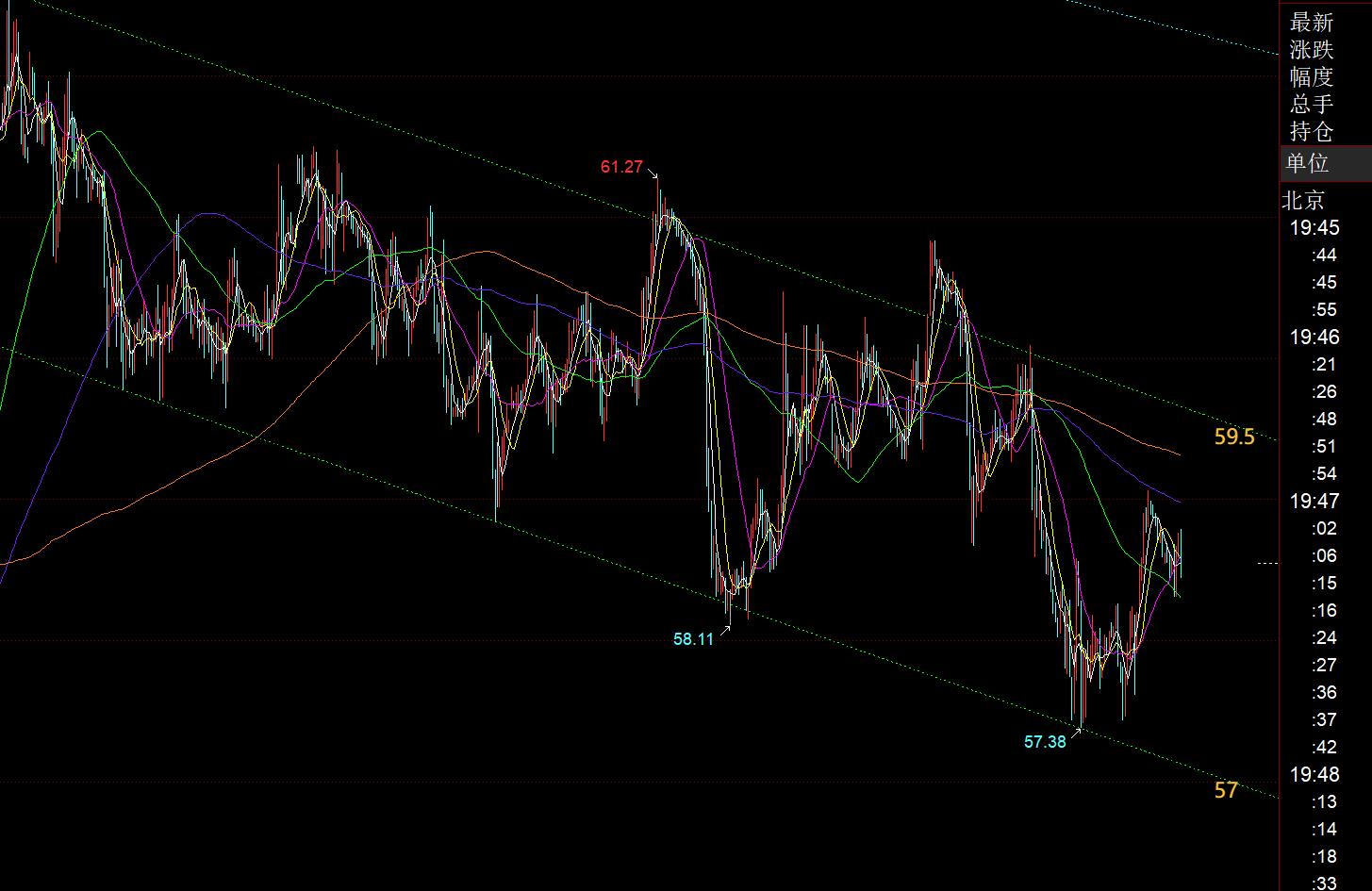 原油方面:继续围绕一个月以来的这张图,上轨阻力下移至59.5,下轨支撑上移至57,区间内靠边看震荡;