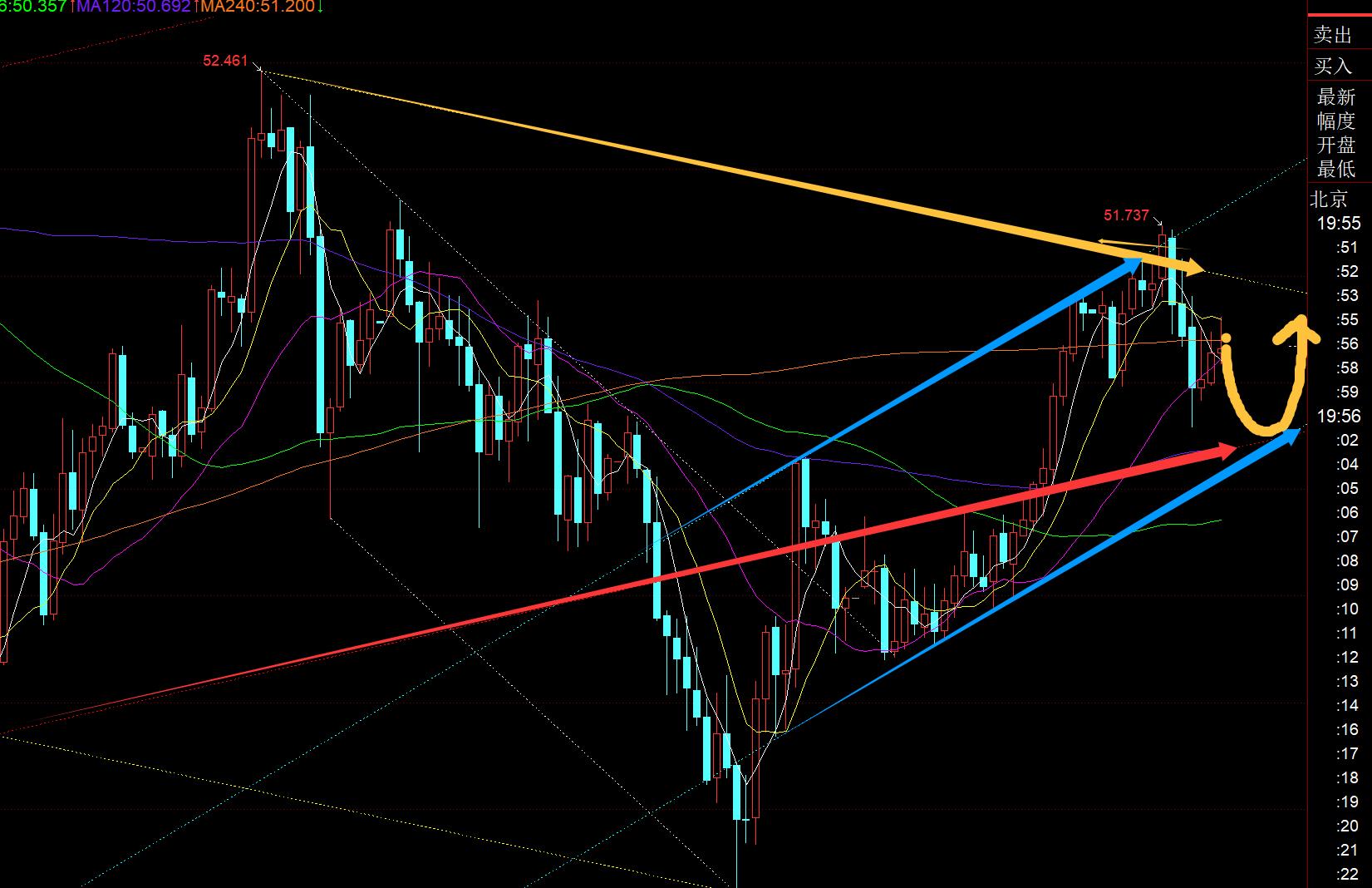 第二,白银方面:昨日早间白银是相对抗跌,回踩一直稳住小时线中轨,最终欧盘企稳震荡拉升一波,美盘再次震荡二次拉升跟随,抵达51目标;