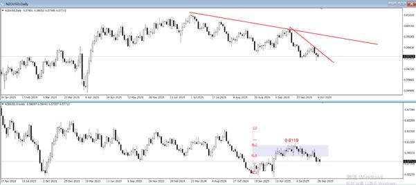 A imagem acima é um gráfico sobreposto da linha diária (superior) e da linha semanal (inferior) NZDUSD. O nível diário mostra um padrão de queda de onda. Após cada rodada de ondas caindo, haverá uma banda de recuperação relativamente significativa. Embora a tendência de médio prazo seja curta, a negociação de curto prazo em NZDUSD não é tranquila devido às frequentes bandas de recuperação, e você precisa estar sempre alerta para o fundo do mercado.