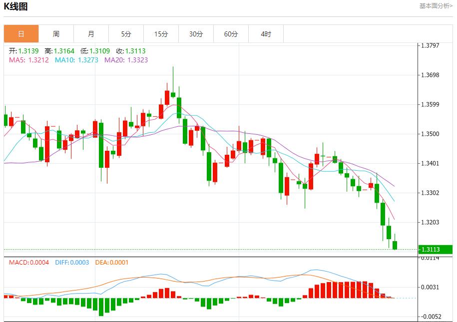 英鎊/美元:截止北京時間20:23,英鎊/美元下跌,現報1.3114,跌幅0.27%。紐市盤前,在最近一日的盤中交易中,(GBPUSD)價格下跌,在短期內主要的熊市趨勢占主導,其價格沿趨勢線交易,確認了這一下行趨勢的延續,同時由於其價格交易低於EMA50,技術壓力持續,當前可持續回升的可能性降低。
